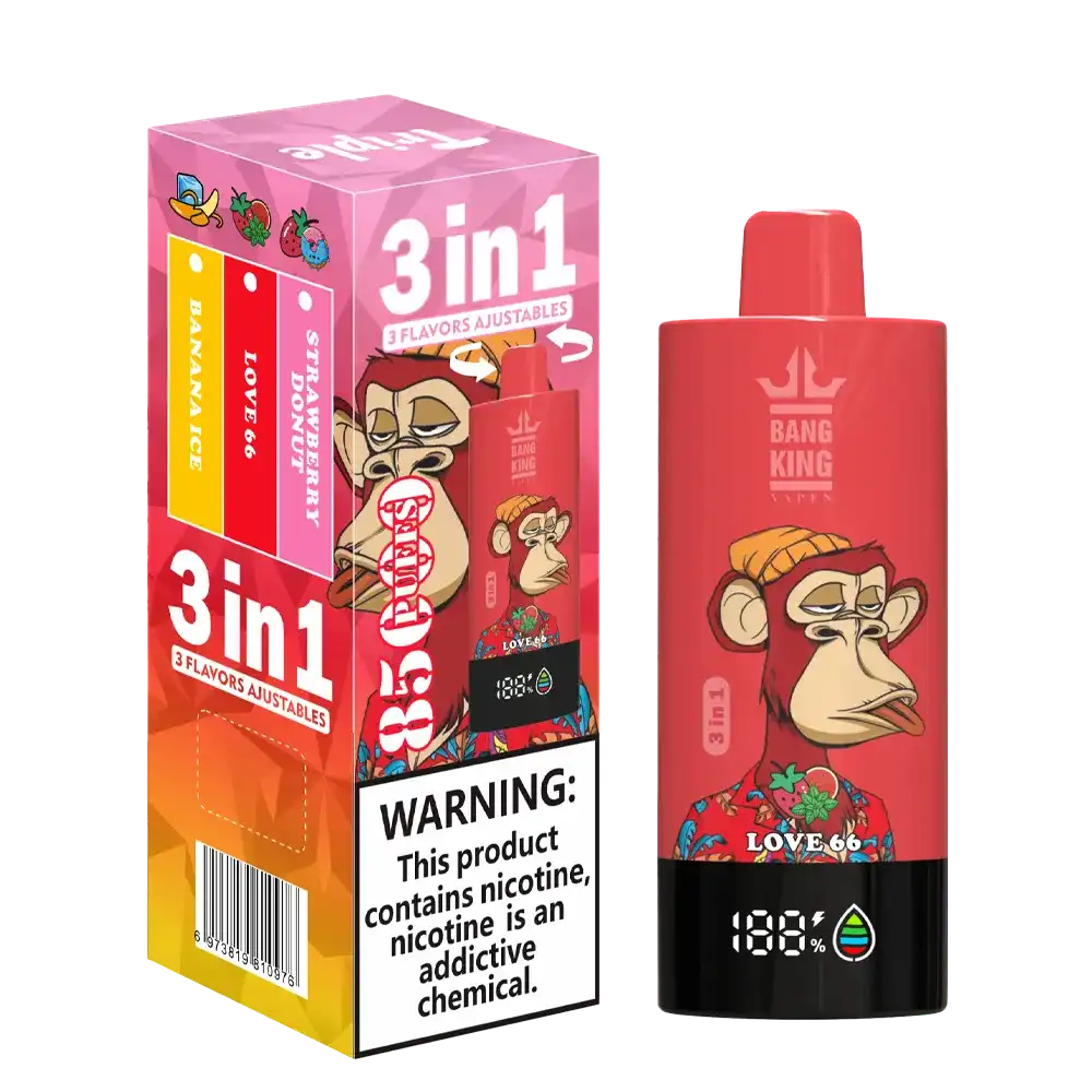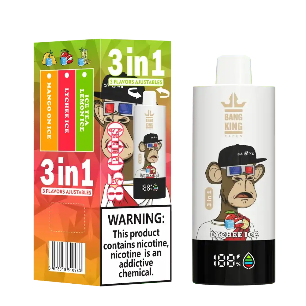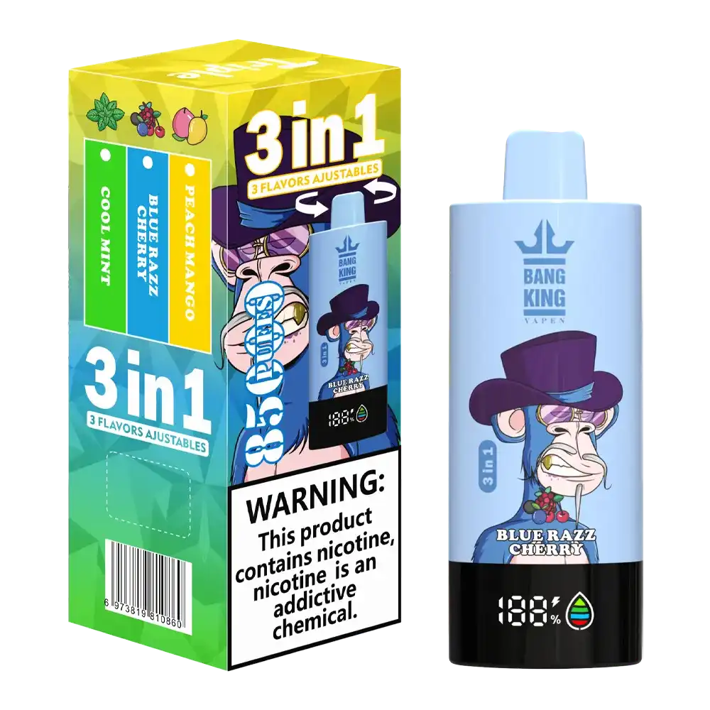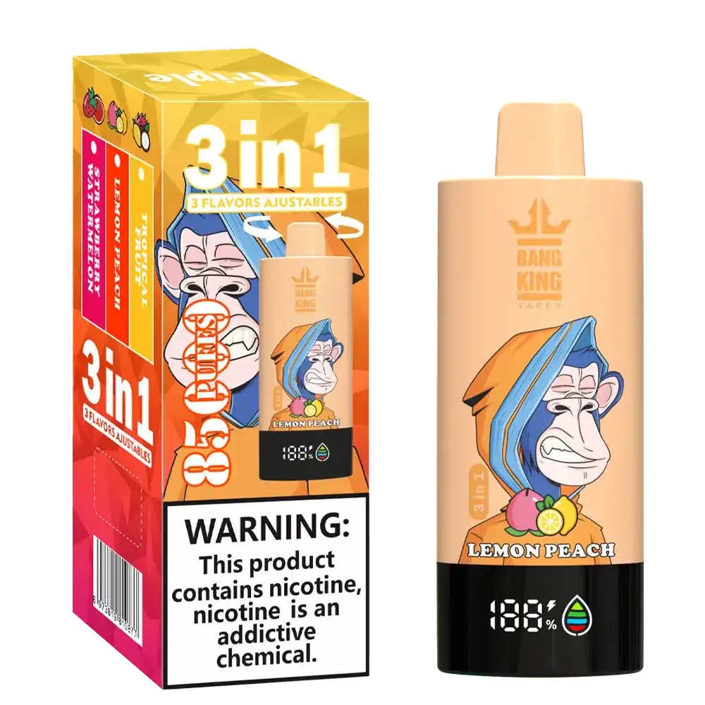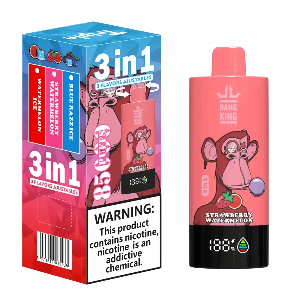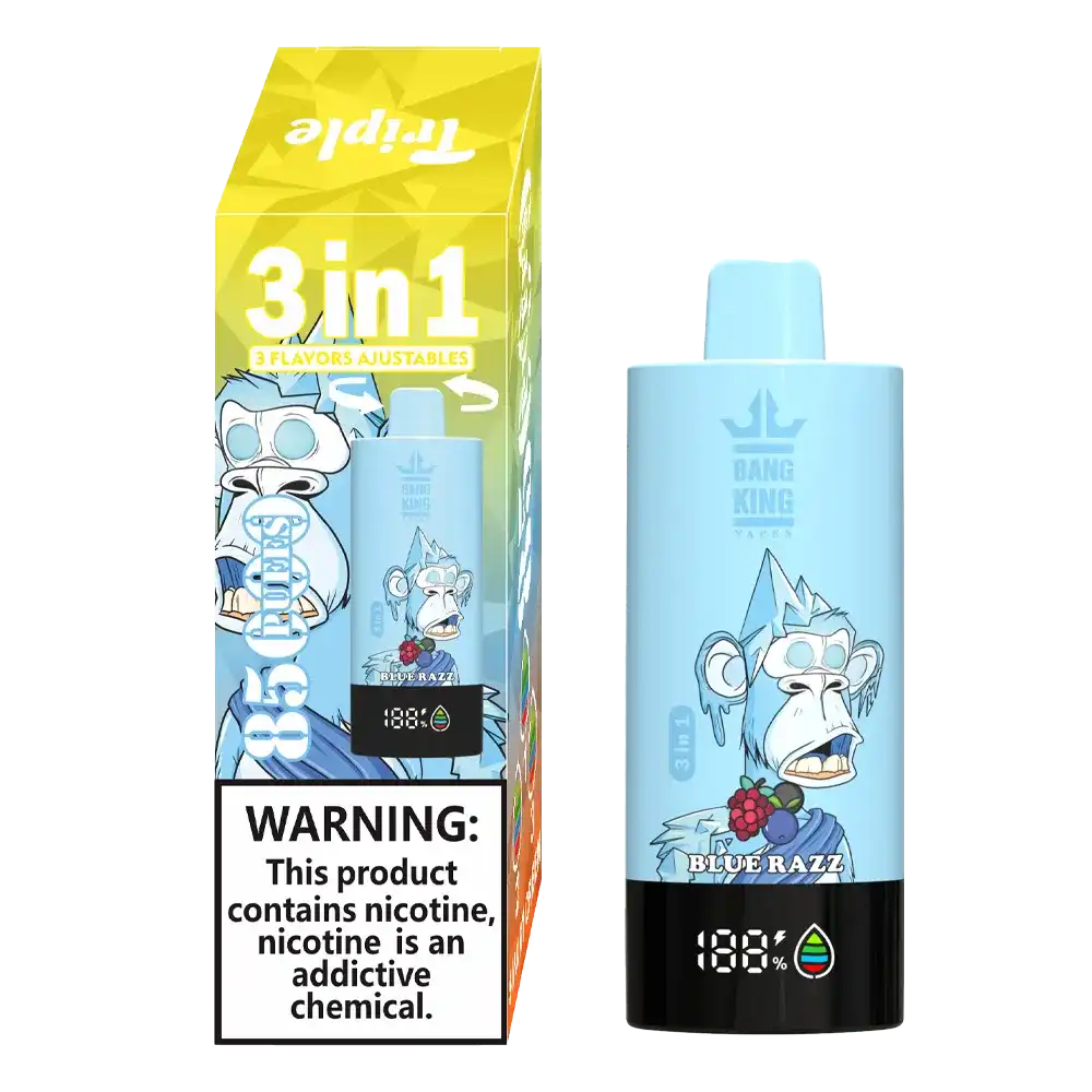 Bang King 85K (85000) Puffs 3 In 1 Disposable Vape – Experience Triple Flavors and Long-lasting Vaping in One Device. The high-efficiency mesh coil enhances vapor smoothness, boosts flavor depth, and provides instant heating for a full-bodied draw with every inhale.