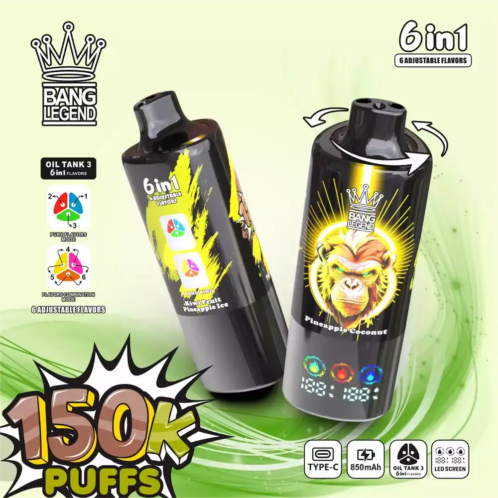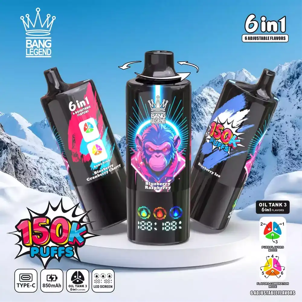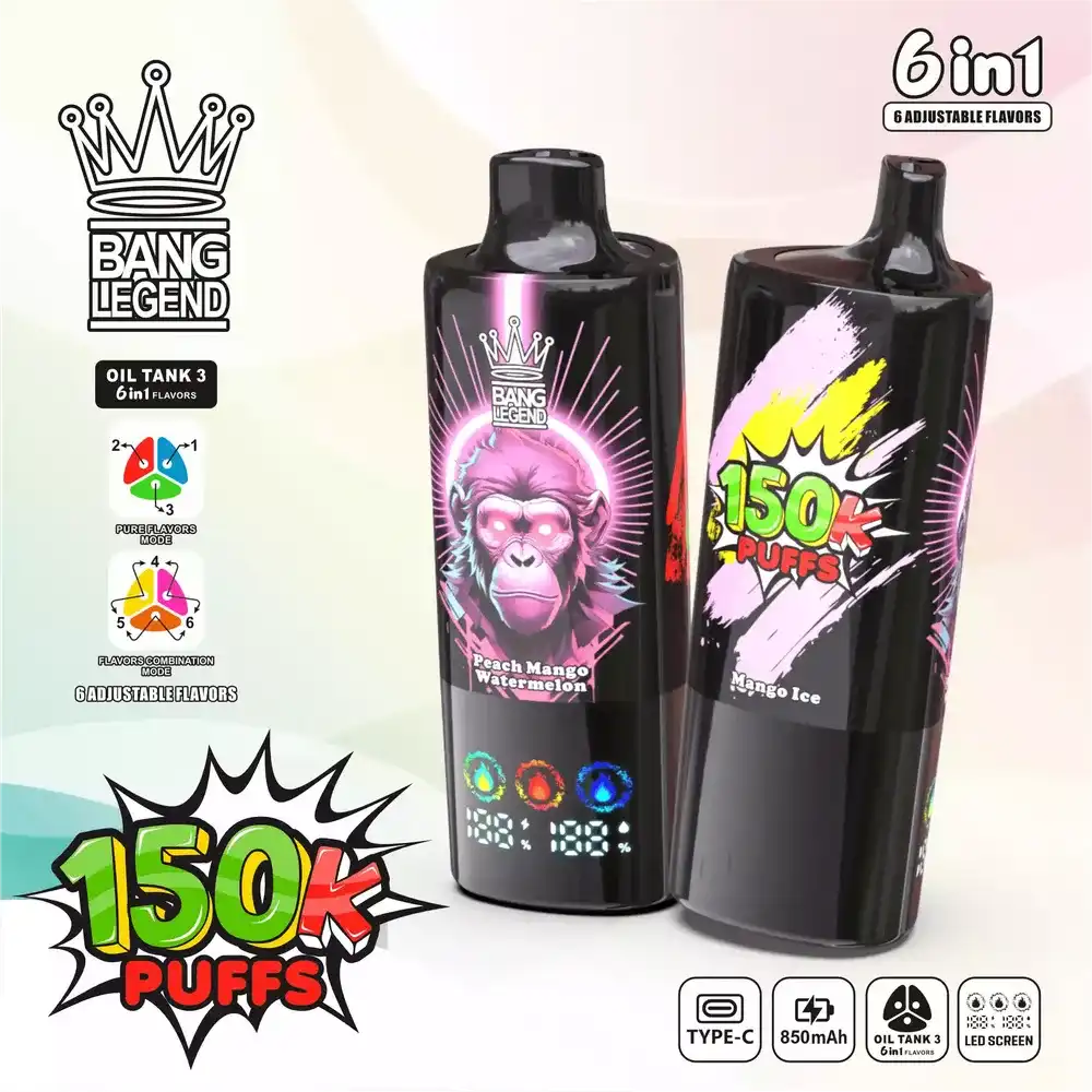 The Bang Legend 150K (150000) Puffs Disposable Vape: a next-generation disposable vape that blends massive longevity with variety. With six switchable flavor chambers, a high-capacity e-liquid reservoir, and smart design built for performance, this device is tailor-made for resellers and heavy users alike.